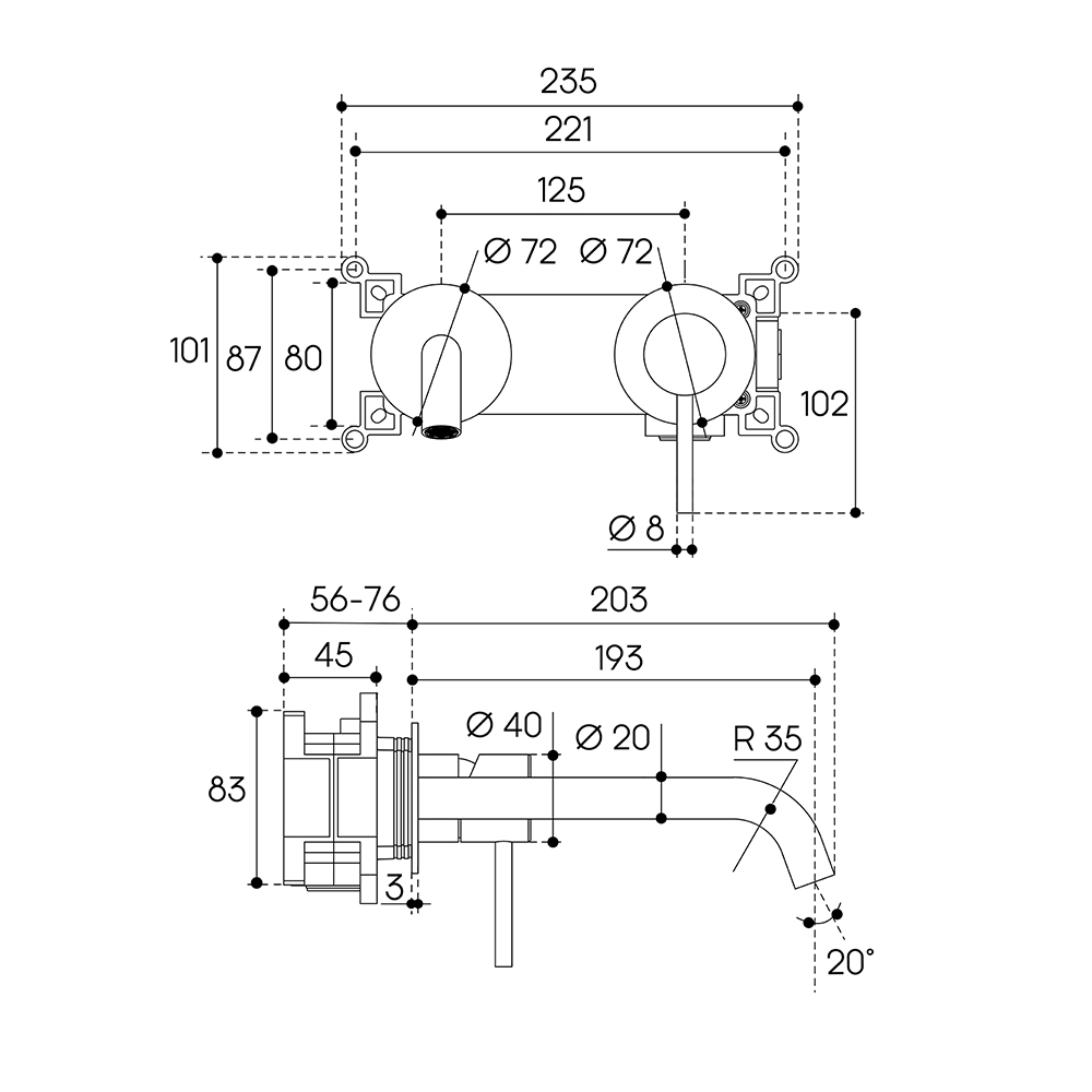 КАНО/CANO, Смеситель для раковины настенного монтажа со скрытой частью, Хром